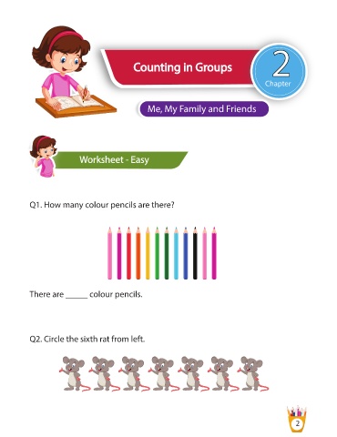 2 Counting in Groups Chapter Me, My Family and Friends Worksheet - Easy Q1. How many colour pencils are there? There are _____ colour pencils. Q2. Circle the sixth rat from left. 2