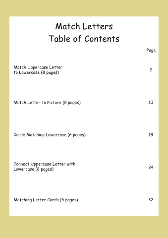 Match Letters Table of Contents Page Match Uppercase Letter 2 to Lowercase (8 pages) Match Letter to Picture (8 pages) 10 Circle Matching Lowercase (6 pages) 18 Connect Uppercase Letter with Lowercase (8 pages) 24 Matching Letter Cards (5 pages) 32