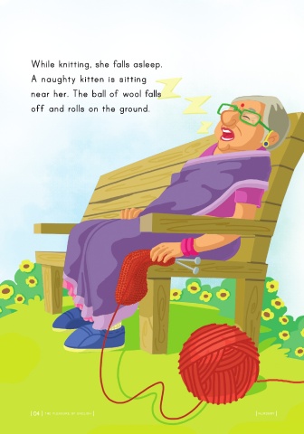 While knitting, she falls asleep. A naughty kitten is sitting near her. The ball of wool falls off and rolls on the ground.