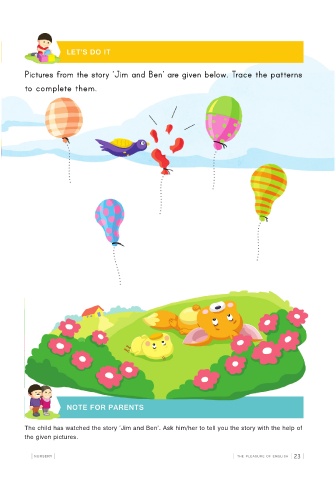 Pictures from the story ‘Jim and Ben’ are given below. Trace the patterns to complete them. The child has watched the story ‘Jim and Ben’. Ask him/her to tell you the story with the help of the given pictures.