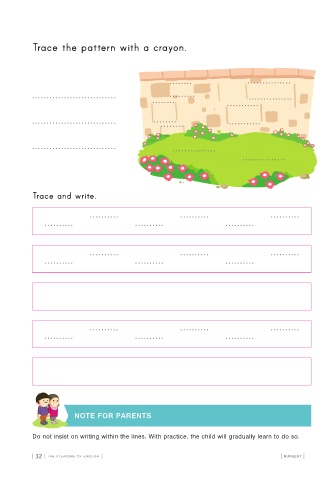 Trace the pattern with a crayon. Trace and write. Do not insist on writing within the lines. With practice, the child will gradually learn to do so.