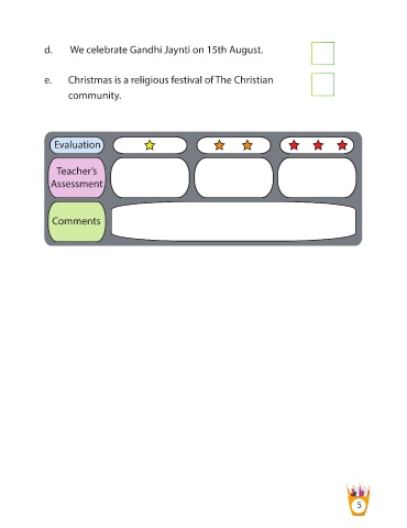 d. We celebrate Gandhi Jaynti on 15th August. e. Christmas is a religious festival of The Christian community. Evaluation Teacher’s Assessment Comments 5