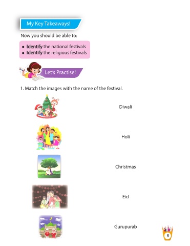 My Key Takeaways! Now you should be able to: Identify the national festivals Identify the religious festivals Let’s Practise! 1. Match the images with the name of the festival. Diwali Holi Christmas Eid Gurupurab 8