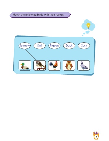 Match the following birds with their names. Sparrow Owl Pigeon Duck Cock 3