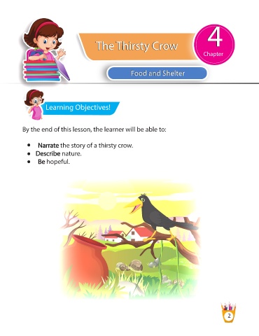 44 he T T y hirst The Thirsty Crow w o r C Chapter ood and Shelt Food and Shelterer F Learning Objectives! By the end of this lesson, the learner will be able to: Narrate the story of a thirsty crow. Describe nature. Be hopeful. 2