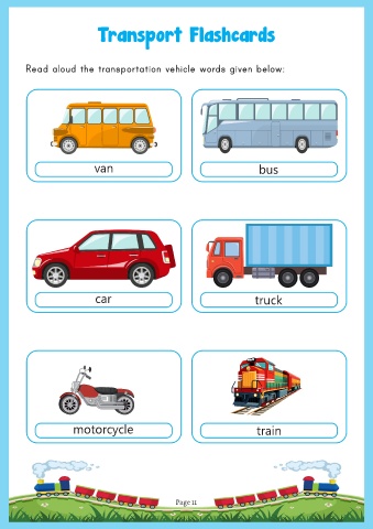 Transport Flashcards Read aloud the transportation vehicle words given below: van bus car truck motorcycle train Page 11