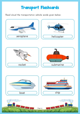 Transport Flashcards Read aloud the transportation vehicle words given below: aeroplane helicopter rocket submarine boat ship Page 12