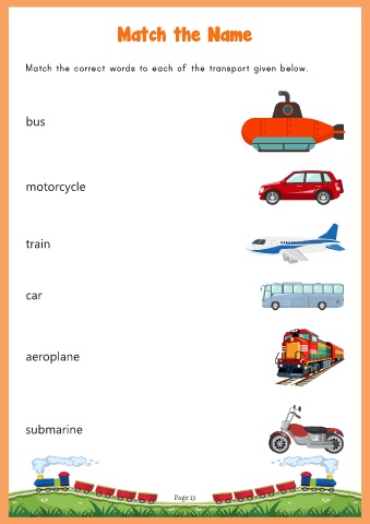 Match the Name Match the correct words to each of the transport given below. bus motorcycle train car aeroplane submarine Page 13